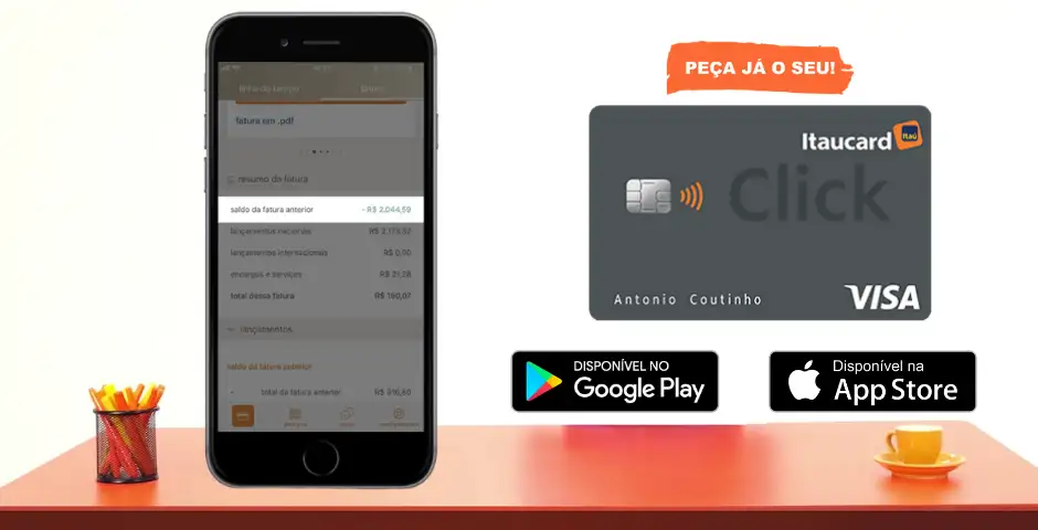 Todas as movimentações do seu cartão Click podem ser conferidas através do aplicativo Itaucard, disponível nas principais lojas de aplicativos. Através do App Itaucard, você pode acompanhar seus gastos, conferir extratos, ficar por dentro de benefícios e notícias, por exemplo.